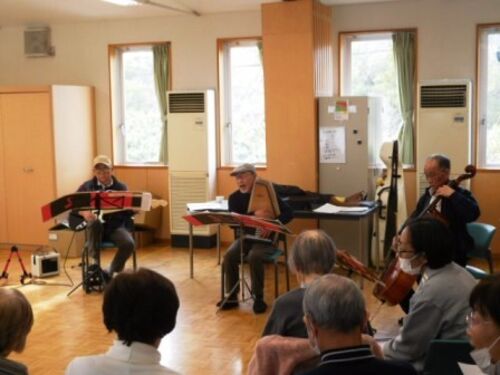 こんにちは!今回は「音を楽しむ会」の様子をお伝えしたいと思います。 音を楽しむ会は「MEO48」のボランティアさん3名がチェロ、コードハープ、エレキギターを演奏してくださり、演奏に合わせて歌を歌う会です。 ちなみにMEO48とはMusic Enjoy Ojisanだそう…