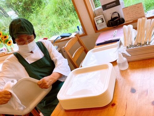 こんにちは、デイセンターういずです 今回は、パン工房ういずの活動風景をお伝えします。 オープンに向けて利用者さんがトレーを拭いて下さっています。 トレーやトングをアルコール消毒でしっかり丁寧に拭き取り✨ こちらでは、今日お店に並ぶパンの商品札を…