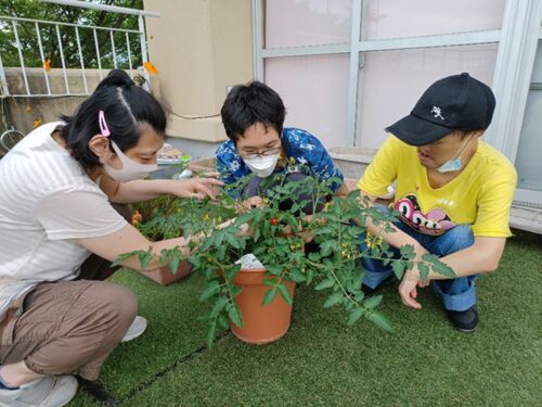 こんにちは、名張育成会生活介護事業所のともです。 6月に植えたトマトの苗が育ち、真っ赤なトマトが実りました (「チェリートマト」という品種で低く育ってたわわになるみたいです) 「赤い実発見~!」 「豊作やなあ」 「写真もええけど、早よ食べさせて~…