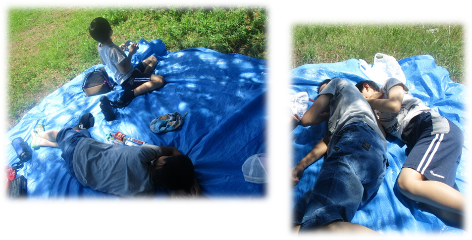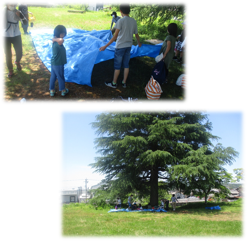 ちょうどいい木陰を見つけてブルーシートを広げ