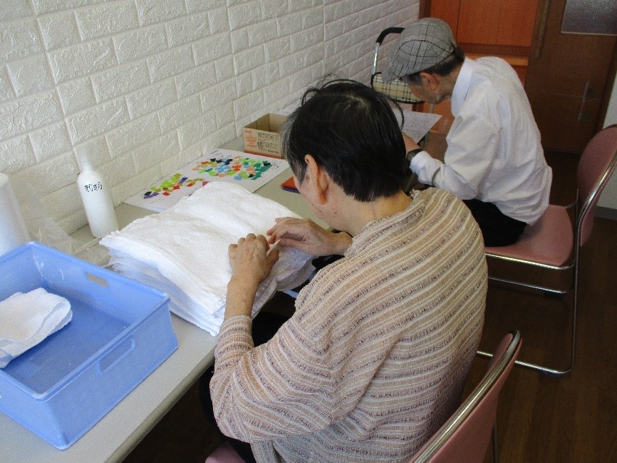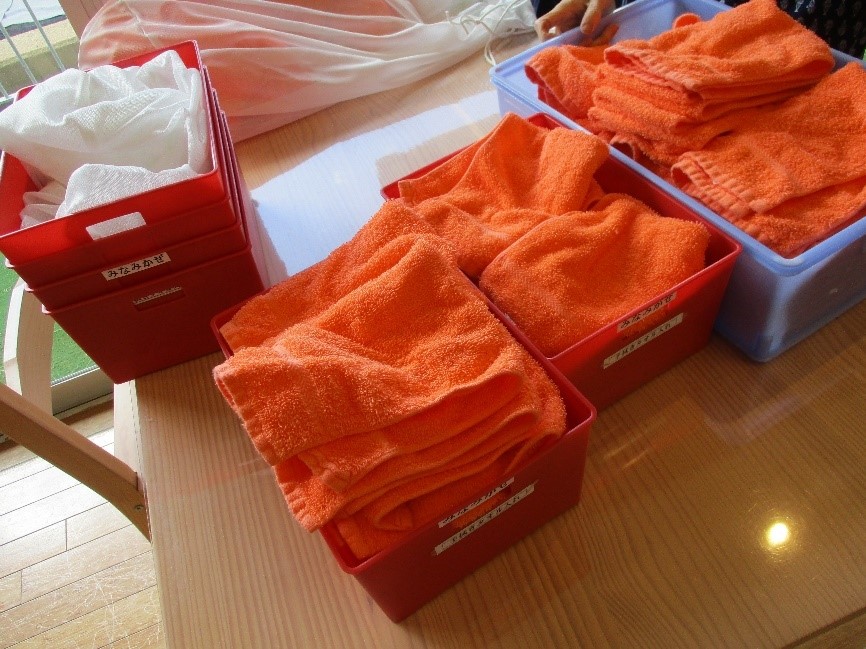 また、この部屋以外にもフロアにある机にて、食堂で使用するオレンジ色のタオルや入浴場面で使用する黄色のタオルを畳んで下さる利用者さんもいらっしゃいます。「これ何のタオル?」「どこで使うの?」「食堂や!」と笑顔で教えて下さいます。