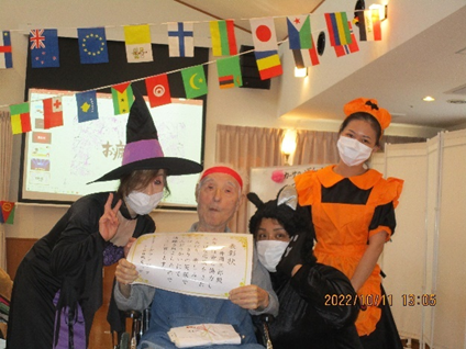 仮装した職員が、入居者さんに日頃の感謝を込めておひとりおひとりに参加賞と賞状をお渡ししました。