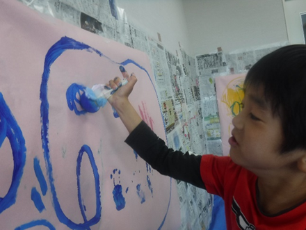 たんぽから絵筆に変えると、絵具で遊ぶことができました。