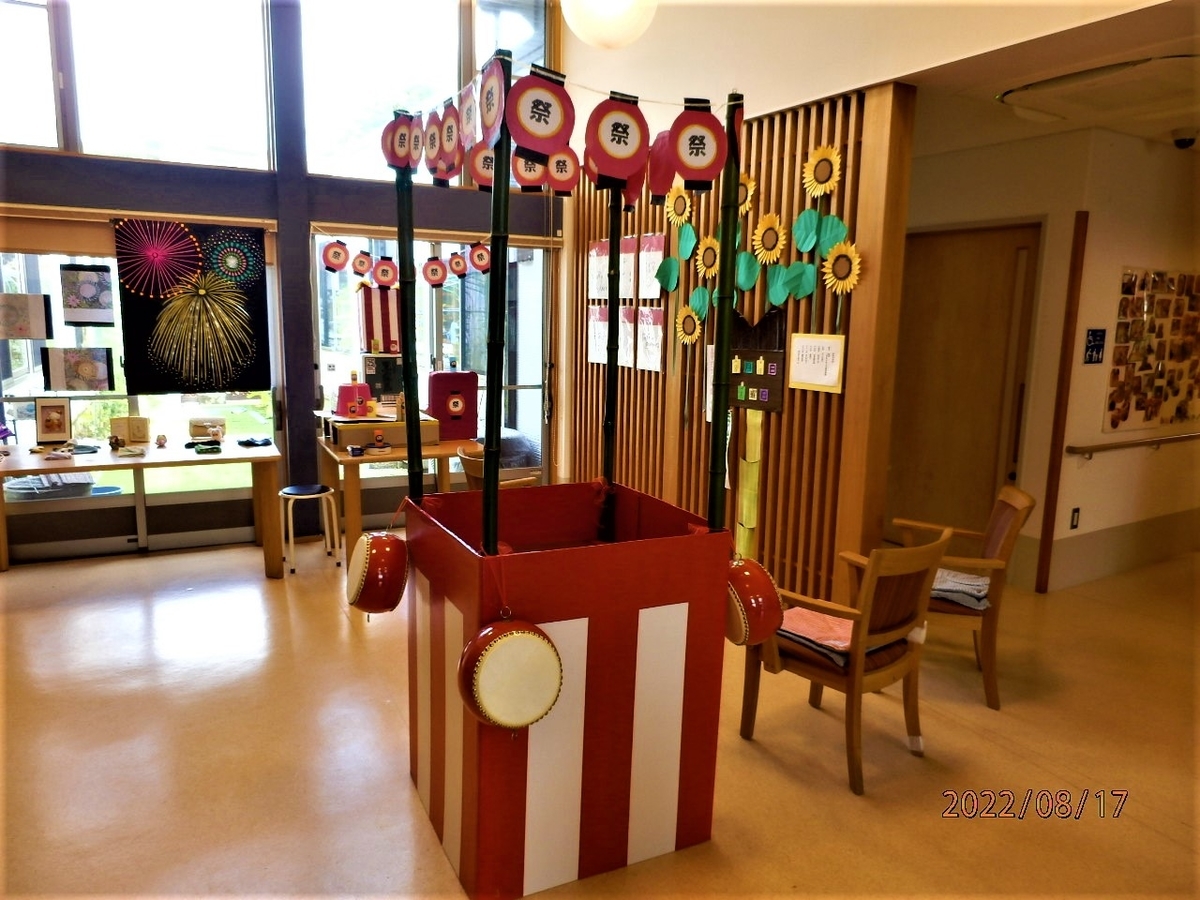 夏はかき氷と盆踊り大会。盆踊り大会では、遠目で見れば人も登れるのでは――と、思ってしまいそうな立派な櫓を、職員のご家族が作ってくださり、入居者さんにも大いに喜んでもらいました。