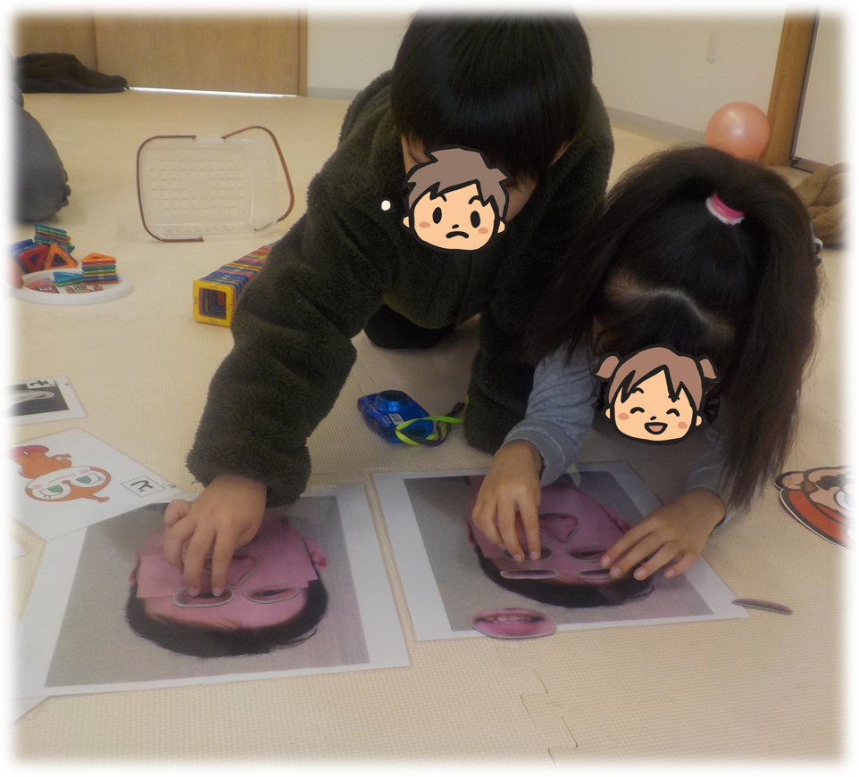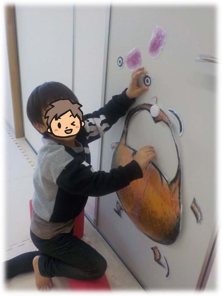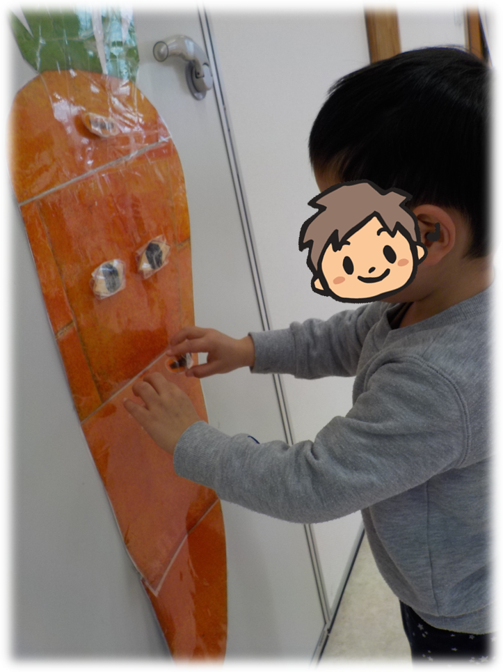 こちらは子どもたちに人気の絵本の「やさいさん」「だるまさん」の福笑いです!