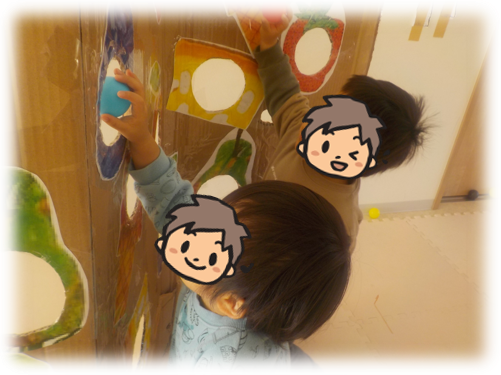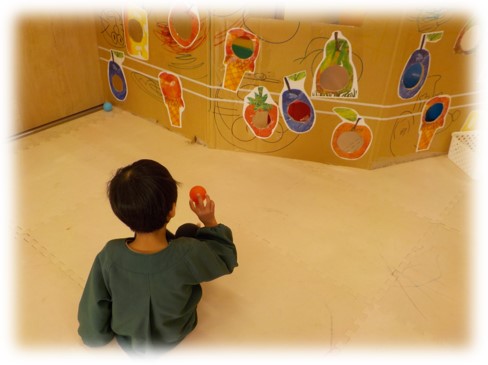 大きな段ボールの板に“はらぺこあおむし”の絵本に出てくる
