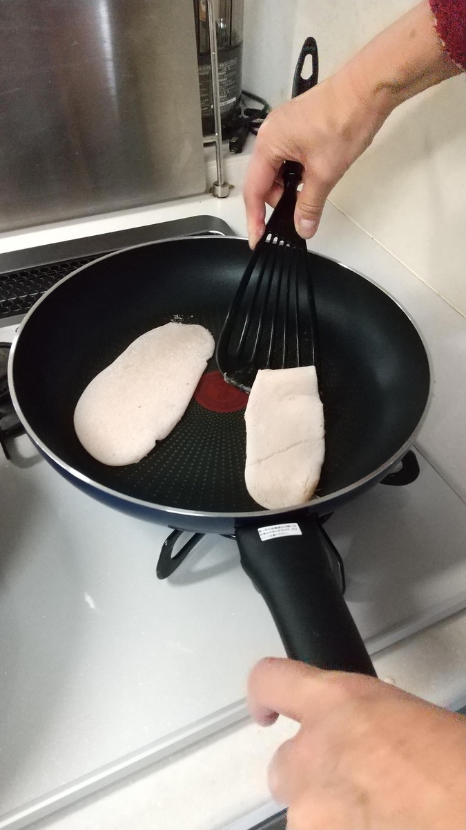 続いて、フライパンで先程混ぜた生地を焼きます。