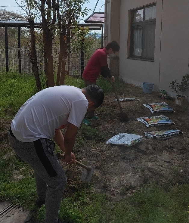 利用者の方も一緒にスコップと鍬を使って掘り返しています。