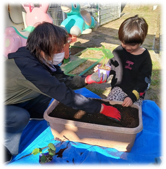 ブルーシートの上にたくさん並んだプランター、一つずつポットに入った色んな葉っぱの苗、砂場とは違ったふんわりとした土の感触、ちょっと特別感のある作業に、興味を示し楽しそうな様子がみられました。