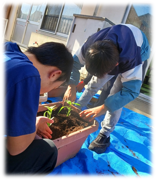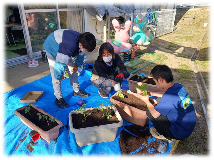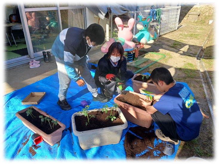この日はプランターに野菜の土を入れて夏野菜の苗植えをしました。