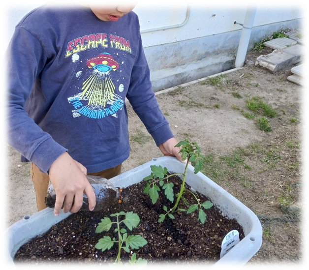 「キュウリ!!」「トマト!!」と言いながら、急いでペットボトルに水を入れて持ってきたと思ったら、せっせと苗に水やりをしていました。