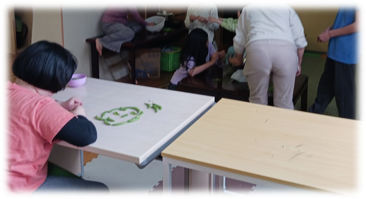 この日は、職員の自宅の畑で大量に収穫された新鮮なスナップエンドウが登場しました!!
