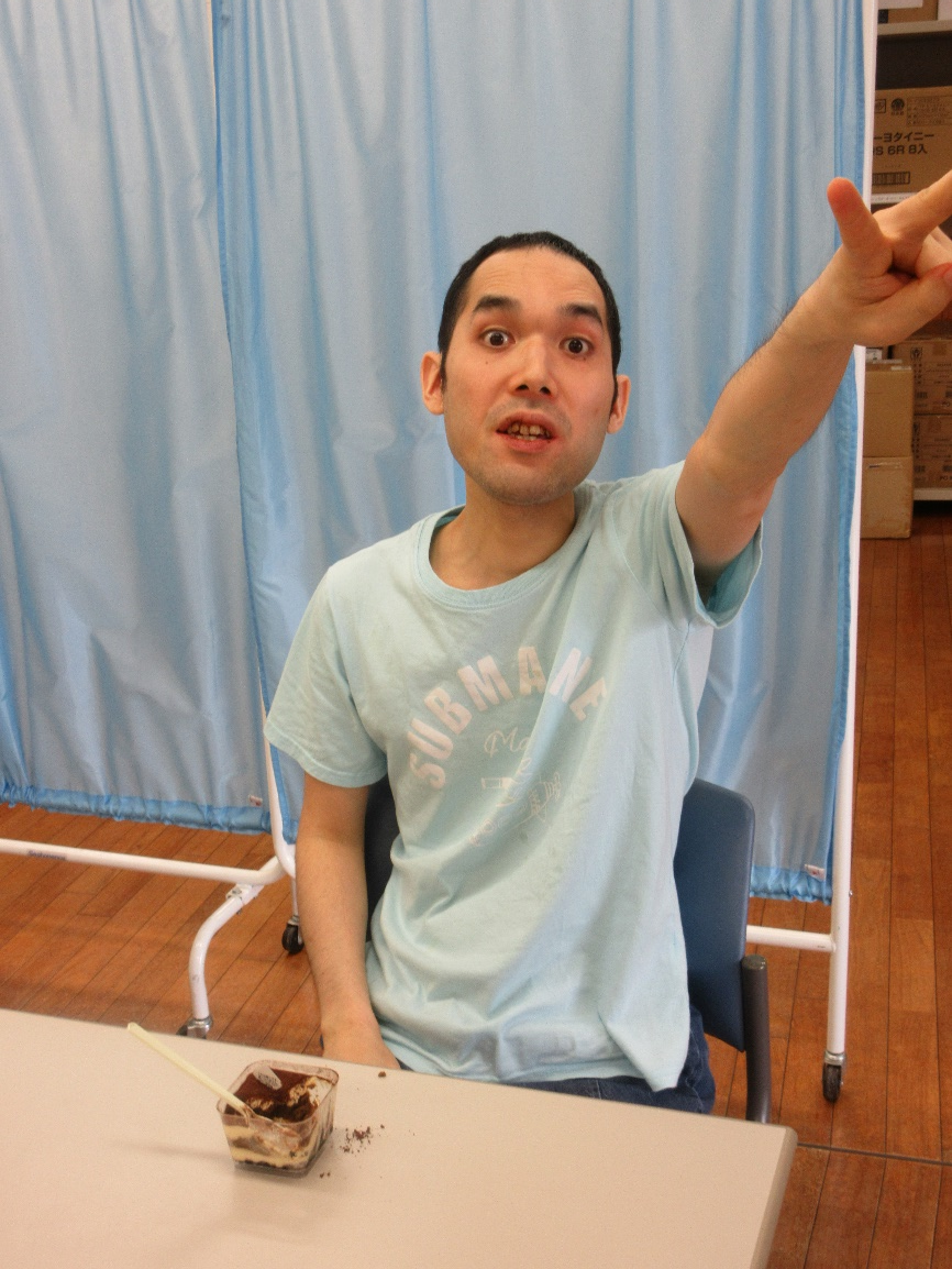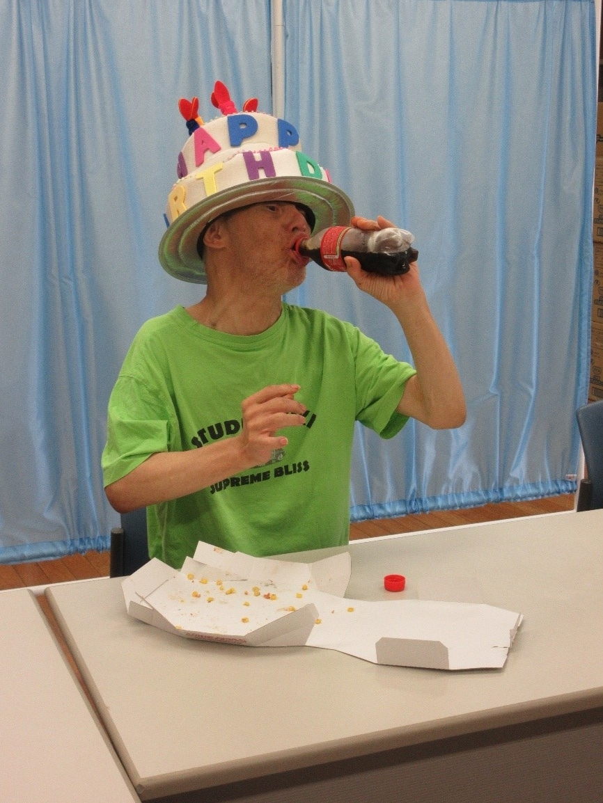 パーティーハットを被ってコーラを勢いよく一気飲み!飲み終わった後、「ガハハハッ」と大笑いしていました。満足そうな表情が見られて、私たちも大満足でした!!