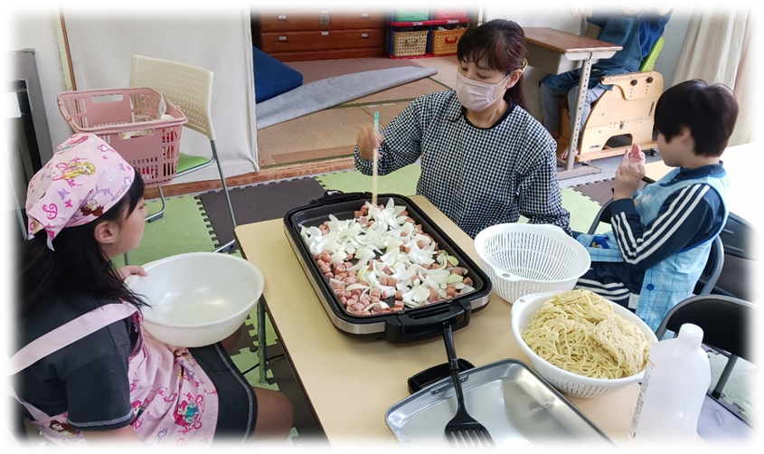 おまつり気分で焼きそばやフライドポテトを作り、お昼ごはんに食べました。